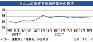 トルコ統計局(TUIK)は23日、10月の消費者信頼感指数(稼働日数・季節要因調整済み)が83.6ポイントと…