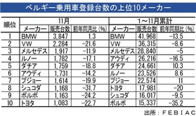 ベルギー新車登録台数、11月は11.8%減少