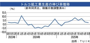 トルコ統計局(TUIK)は10日、10月の鉱工業生産指数(2021年=100、稼働日数調整済み)が110.4ポイントとなり、前年同月比2.2%上昇したと発表した。伸びは9月の3%(改定値)から減速した。